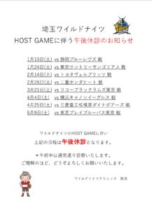 埼玉ワイルドナイツ HOST GAMEに伴う午後休診のお知らせ