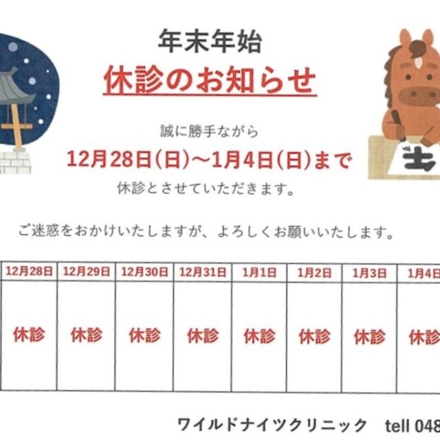 年末年始 休診日のお知らせ 2025年12月13日 お知らせ 年末年始 休診日のお知らせ 年末年始休診:令和7年12月28日(日)~令和8年1月4日(日) 令和8年1月5日(月)から通常診察を行います。 ご理解の程、よろしくお願いいたします… 続きを読む