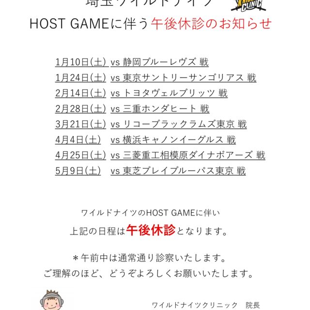 埼玉ワイルドナイツ HOST GAMEに伴う午後休診のお知らせ 2025年12月13日 お知らせ 埼玉ワイルドナイツ HOST GAMEに伴う午後休診のお知らせ 上記日程は「埼玉ワイルドナイツHOST GAME」のため 午後休診となります。 *午前中は通常通り診察といたします… 続きを読む